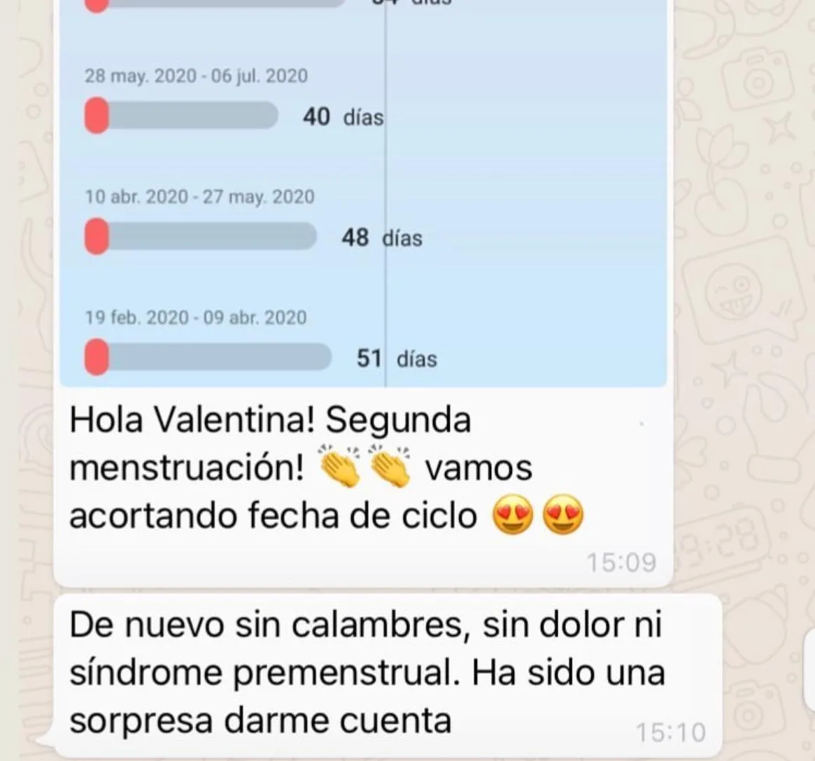 "Hola Valentina! Segunda menstruación. 👏👏 vamos acortando fecha de ciclo 😍😍. De nuevo sin calambres, sin dolor y sin síndrome premenstrual. Ha sido una sorpresa darme cuenta."
